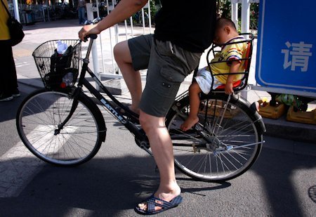 Em bé ngủ gật trong lúc ngồi sau xe đạp.