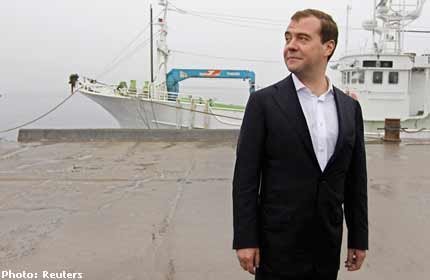 | Thủ tướng Nga tới thăm một nhà máy đánh bắt cá ở đảo Kunashir vừa qua. |
