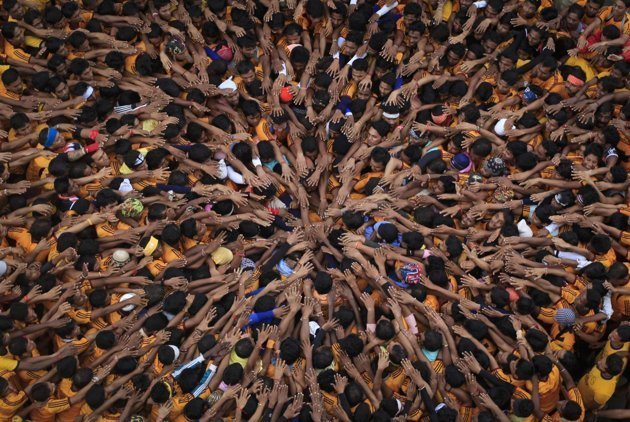Các tín đồ tạo nên một kim tự tháp người để đập vỡ một nồi đất chứa sữa đông trong lễ Janmashtami linh thiêng của người Hindu ở Mumbai, Ấn Độ. REUTERS/Danish Siddiqui