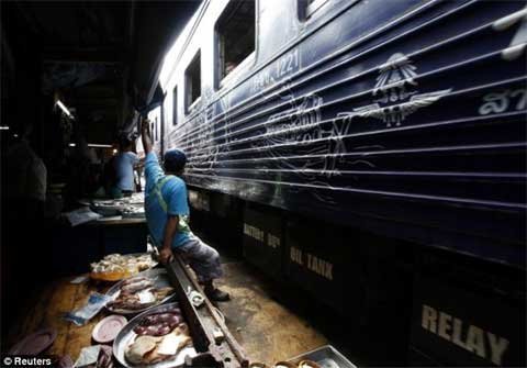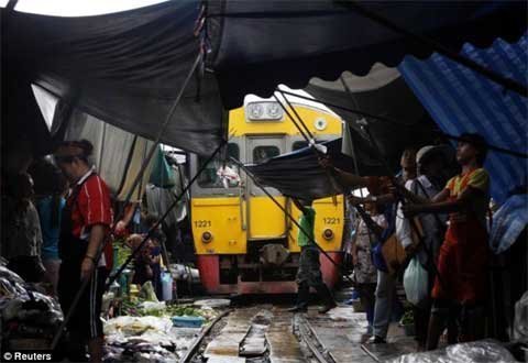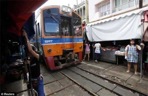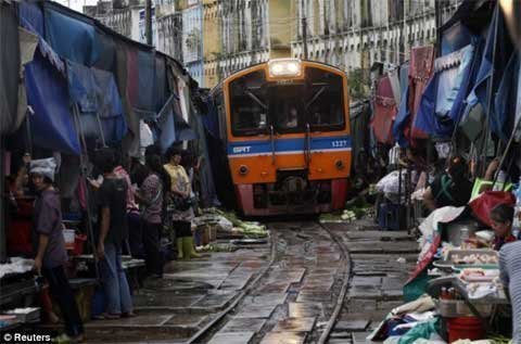 Tám lần một ngày, tàu hỏa phải luồn lách qua một khu chợ đầy các