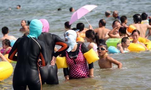 Trong khi hầu hết mọi người đều mặc thật mát mẻ khi xuống biển thì hàng loạt phụ nữ trung niên ở Trung Quốc lại ăn vận như không khác gì những Ninja.