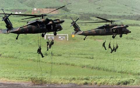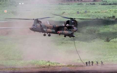 Di chuyển bằng cách tóm lấy dây thừng thả xuống từ trực thăng CH-47J Chinook