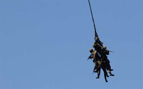 Binh sĩ chuẩn bị được trực thăng Chinook đưa đi nơi khác bằng cách tóm vào dây thừng