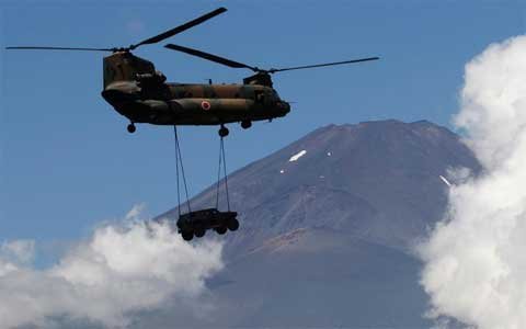Trực thăng CH-47J Chinook vận chuyển một chiếc xe bọc sắt trước núi Fuji