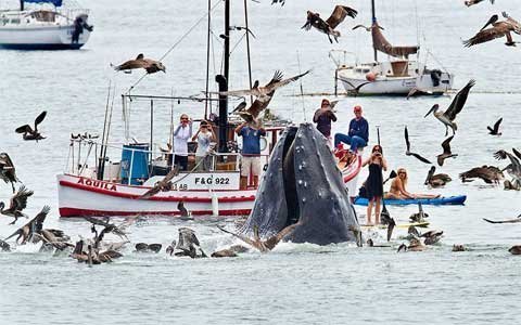 Du khách được chứng kiến một cảnh tượng ngoài mong đợi khi chứng kiến cảnh cá voi được cho ăn ở ngoài khơi bờ biển California. Ít nhất 1 hoặc hai con cá voi lưng gù đã liên tục vọt khỏi mặt nước khi được cho ăn cá sardine, trong hơn một giờ ở San Luis Obispo gần Los Angeles...Ảnh Bill Bouton/AP