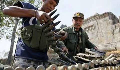 Lính Campuchia chuẩn bị đạn dược gần đền cổ Preah Vihear sau một vụ đọ súng