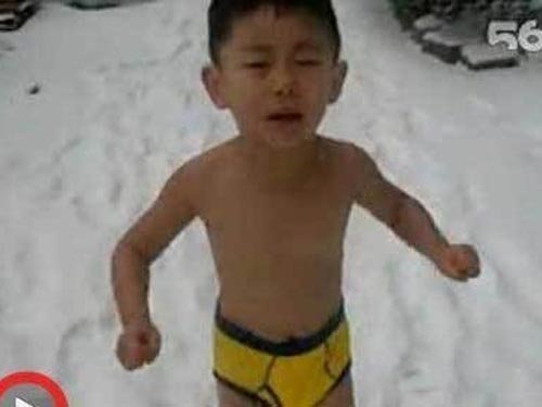 Trong đoạn video, cậu bé Duoduo, chỉ mặc một chiếc quần đùi, đi giày và chạy trên con đường phủ tuyết trắng xóa.