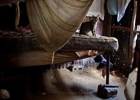 Một chú mèo đứng trên chiếc giường trong căn nhà bị ngập sau khi cơn bão nhiệt đới Isaac quét qua thủ đô Port-au-Prince của Haiti. (Ảnh: AP)