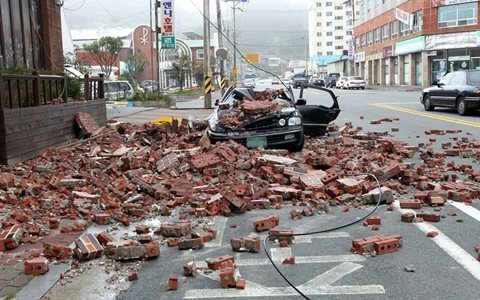 Một chiếc ô tô bị những viên gạch từ một bức tường đổ làm bẹp rúm sau cơn bão Bolaven tại Wando, Hàn Quốc. (Ảnh: Yonhap)