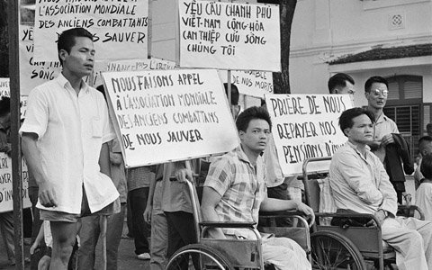 25 cựu binh VNCH bị thương trong chiến tranh Đông Dương, ngồi xe lăn biểu tình trước Đại sứ quán Pháp đòi bồi thường tại Sài Gòn tháng 5/1964 qua ống kính của Roy Essoya.