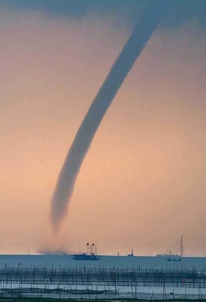 Một vòi rồng khổng lồ hình thành trên hồ Hongze ở tỉnh Giang Tô, Trung Quốc. Nhà nhiếp ảnh Yue Mingyou, người chụp được hình ảnh ấn tượng này cho biết, vòi rồng hình thành lúc 17h30 và kéo dài 25 phút, trong thời gian đó, một cột nước màu xám đã nối mặt hồ với bầu trời.