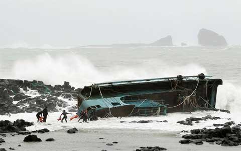Cảnh sát đường biển Hàn Quốc đang cứu một ngư dân khỏi chiếc tàu cá của Trung Quốc bị mắc kẹt ở Seogwipo, đảo Jeju Island. Bão Bolaven, với sức gió lên tới 170 km/h đã tấn công bờ biển phía tây Hàn Quốc, làm 5 người chết trên biển, khiến 10 người mất tích