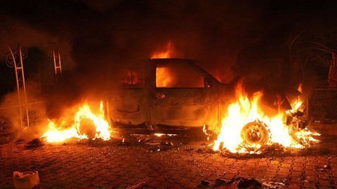 | Xe bị đốt cháy trong khuôn viên lãnh sự quán Mỹ tại Benghazi |