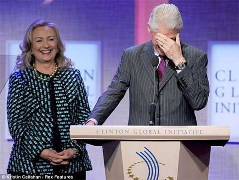 Sự xuất hiện của vợ đã khiến cựu Tổng thống Clinton bối rối khi ông lấy tay che trán trong khi bà Hillary cười tươi ở bục phát biểu tại khách sạn Sheraton.