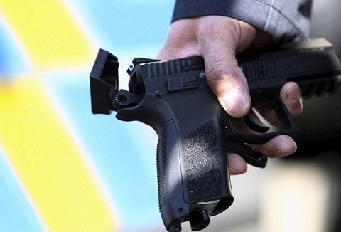 | Khẩu súng tang vật là súng đồ chơi bằng nhựa |