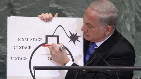 Thủ tướng Israel tuyên bố rằng, Iran đã đi được 70% đoạn đường làm giàu hạt nhân đủ để sản xuất vũ khí. Ông còn dùng bút vạch một đường màu đỏ ở mức 90% trên biểu đồ hình trái bom, mà ông gọi đó là giới hạn của sự kiên nhẫn.