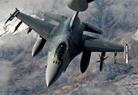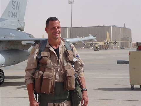 Trung tá Dan Hampton ngồi trong buồng lái của chiến đấu cơ F-16 đã được 20 năm và có hơn 600 giờ chiến đấu, giúp bảo vệ bầu trời Iraq và không phận Mỹ sau các vụ tấn công khủng bố ngày 11/9.
