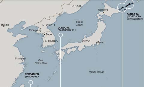 Nhật Bản hiện đang 'mắc kẹt' trong ba quần đảo tranh chấp: Dokdo/Takeshima với Hàn Quốc, Senkaku/Điếu Ngư với Trung Quốc và nam Kuril với Nga. |