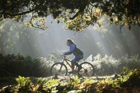 Một phụ nữ đạp xe vào sáng sớm mùa thu tại công viên Richmond, tây nam London