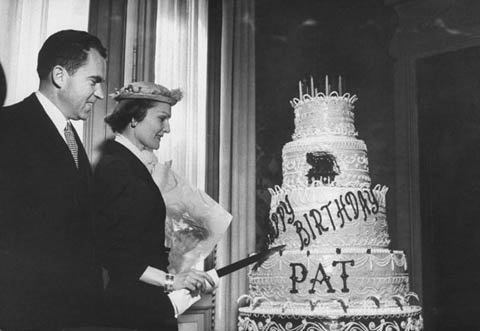 Cựu Tổng thống Richard Nixon xem đệ nhất phu nhân Pat cắt bánh