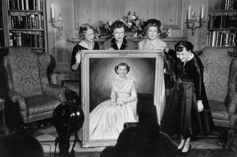 Phu nhân của vị tổng thống Mỹ thứ 34 Dwight D. Eisenhower, Mamie Eisenhower (ngoài cùng bên phải) bên bức chân dung của mình trong sinh nhật lần thứ 60. (Ed Clark—Time & Life Pictures/Getty Images)