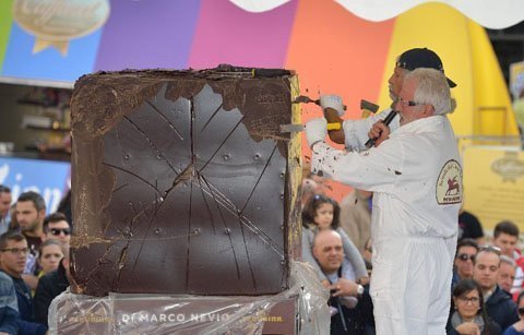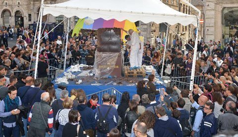 Các nhà điêu khắc đang tạo hình cho một khối socola Perugina.