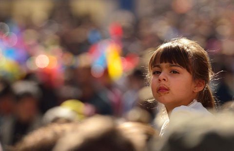 Một bé gái khác với những mẩu socola còn dính trên mặt, ngồi trên lưng cha háo hức nhìn xung quanh.