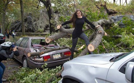 Nana Gouvea, 30 tuổi, đã xuất hiện trong bộ đồ đen bó sát bên đống cây đổ và những chiếc xe hơi bị bẹp rúm sau khi bão Sandy quét qua. Cơn bão này đã khiến hơn 80 người tại Mỹ thiệt mạng.