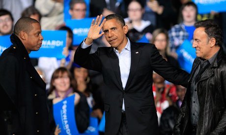 Tổng thống Barack Obama cùng với rapper Jay-Z và ngôi sao nhạc rock Bruce Springsteen tại một buổi vận động tranh cử ở Sân vận động Nationwide, Columbus, bang Ohio. (Ảnh: AP)