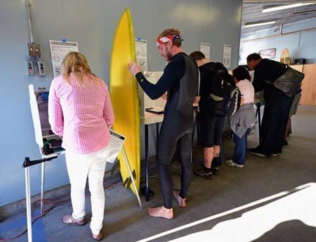 Mike Wigart (thứ hai từ trái sang), ôm cả ván lướt sóng tới điểm bỏ phiếu trong một garage của trụ sở cứu hộ hạt Los Angeles.