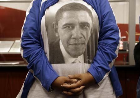 Jackie Smith, một công nhân nghỉ hưu mặc chiếc áo có in hình tổng thống Barack Obama tại Warren, Mich vào ngày bầu cử.