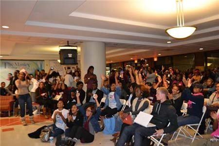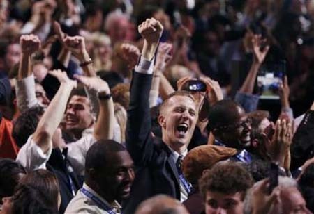 Những người ủng hộ tổng thống Obama đã đứng dậy vỗ tay sau khi các mạng lưới truyền thông dự đoán Obama tái cử trong bữa tiệc theo dõi buổi mít-tinh Đêm Bầu cử Obama tại Cung điện McCormick ở Chicago, Illinois.