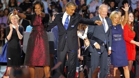 | Vợ chồng Tổng thống Obama, Phó tổng thống Biden ăn mừng chiến thắng. (Ảnh: AP) |