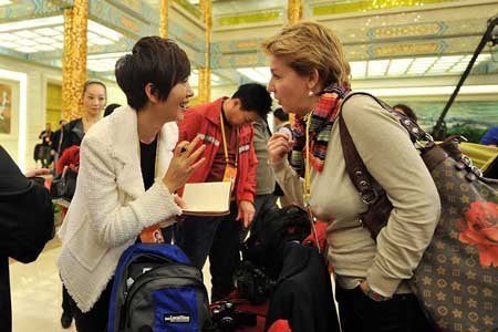 Nữ phóng viên nổi tiếng Ouyang Xiadan đang nói chuyện với một nhà báo nước ngoài.