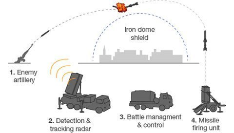 Phản ứng của Israel trước mối đe dọa tên lửa vừa mang tính phòng thủ vừa mang tính tấn công về bản chất. Hệ thống chống tên lửa tương đối mới của nước này - có tên gọi Vòm Sắt (Iron Dome) - đã được vận hành tích cực trong nhưng ngày này. Hệ thống này sẵn sàng hoạt động kể từ năm 2011. Mỗi một trong 4 khẩu đội pháo sẵn sàng có thể bảo vệ được một khu vực có diện tích bằng một thành phố tầm trung.