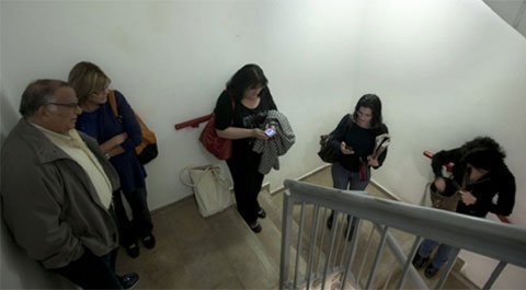 Những người Israel này trú ẩn tại một cầu thang bệnh viện ở Jerusalem, sau một
