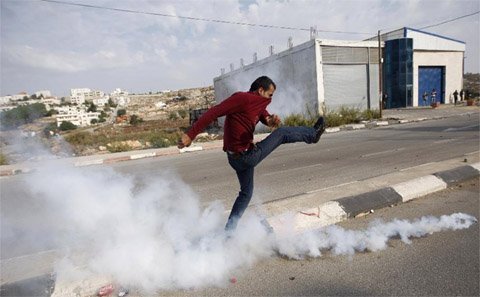 Một thanh niên Palestine ném đạn hơi cay về phía biên giới