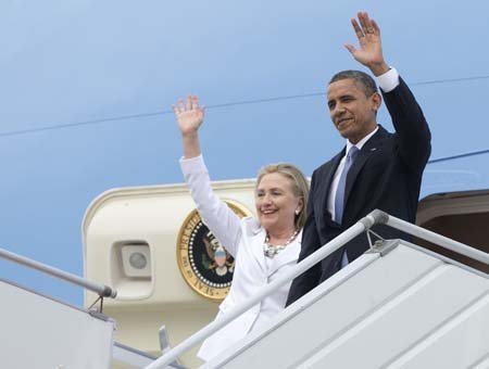 Tổng thống Mỹ Barack Obama và Ngoại trưởng Hillary Rodham Clinton vẫy tay chào khi tới sân bay Quốc tế Yangon, thành phố Yangon, Myanmar trên chiếc Không lực 1. (Ảnh: AP)