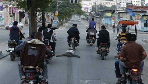 Các tay súng đã buộc xác một trong những người bị nghi là gián điệp của Israel vào phía sau một chiếc xe máy và kéo lê khắp các đường phố chính ỏ Gaza City nhằm cảnh báo những người khác muốn "phản bội" người Palestine.