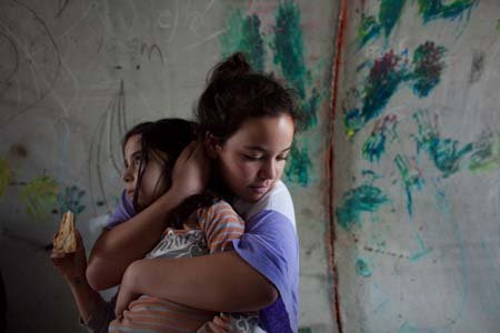 Một bé gái Israel ôm em gái mình khi chúng nấp dưới một cống bê tông lớn được sử dụng làm hầm trú ẩn trong một cuộc tấn công tên lửa từ Dải Gaza hôm 19/11 ở Nitzan, Israel. (Ảnh: Getty Images)