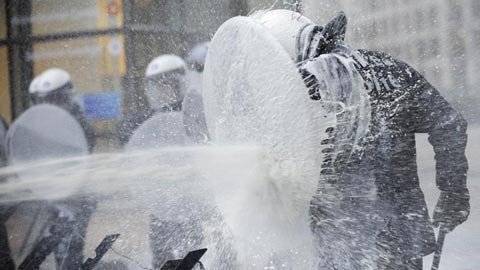 | Người biểu tình phun sữa vào cảnh sát hôm 26/11. (Ảnh: THX) |