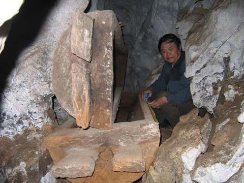 | Quan tài khoét bằng thân gỗ đặt trong ngách núi. |