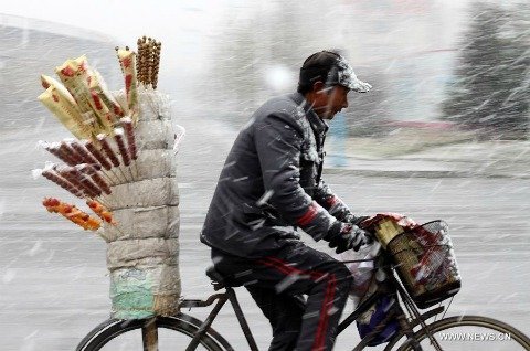 | Một người bán rong đang vất vả đạp xe trong tuyết rơi trắng xóa ở tỉnh Sơn Đông, Trung Quốc. (Ảnh chụp hôm 15/12: THX) |