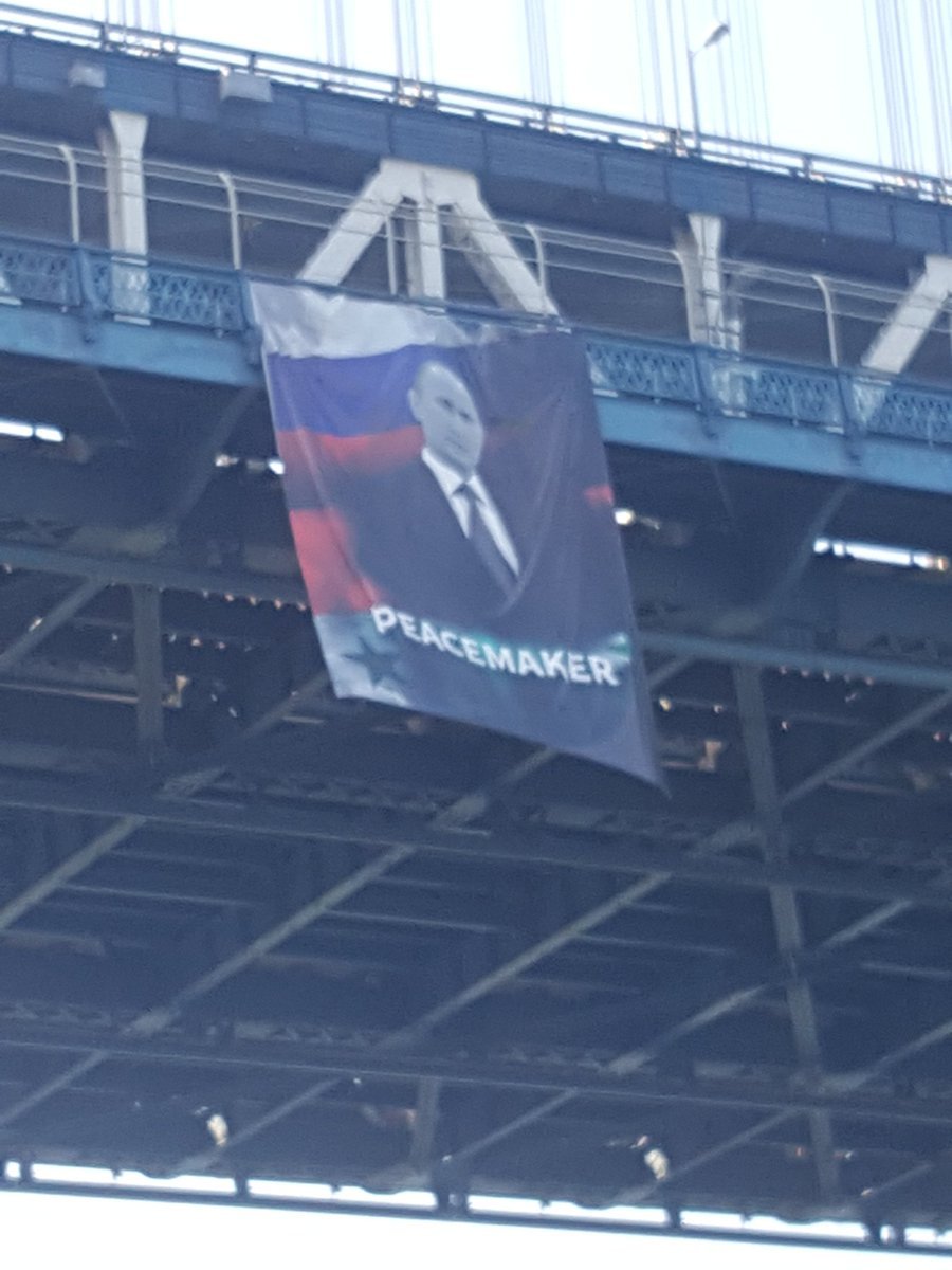 Một bức ảnh khổ lớn in hình Tổng thống Nga Vladimir Putin đã xuất hiện bí ẩn trên cầu Manhattan, New York (Mỹ), hôm 6/10.