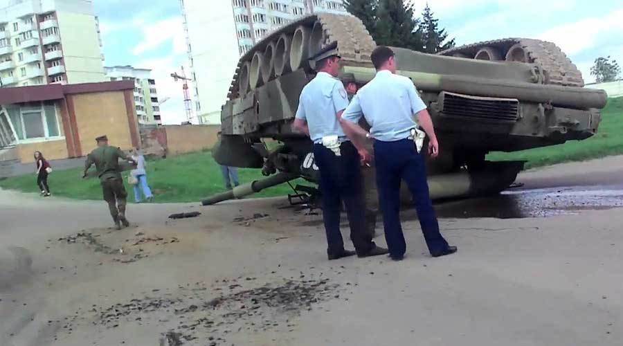 Một chiếc xe tăng chiến đấu T-80 của Nga không may gặp nạn và lộn nhào trên đường, với các bánh xe xích chổng ngược lên trời.