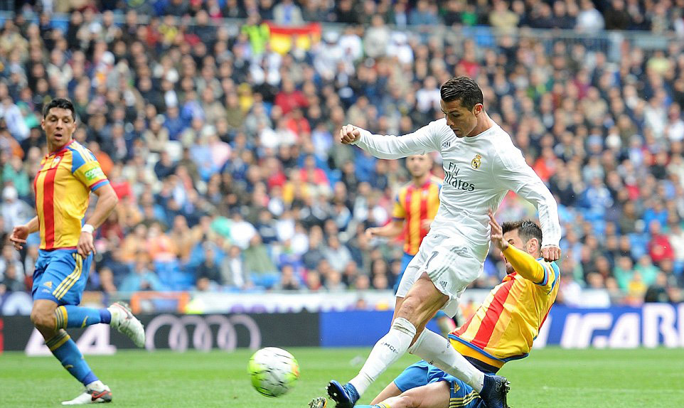 Ronaldo xâm nhập vòng cấm Valencia, nhưng cú sút của siêu sao người Bồ lại đi trúng vào vị trí mà thủ môn Diego Alves đã lựa chọn.
