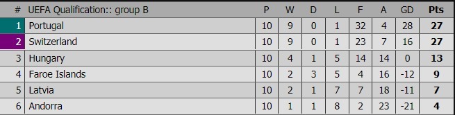 Bảng B: Andorra, Faroe Islands, Hungary, Latvia, Bồ Đào Nha, Thụy Sỹ