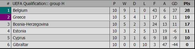 Bảng H: Bỉ, Bosnia-Herzegovina, Đảo Síp, Estonia, Gibraltar, Hy Lạp