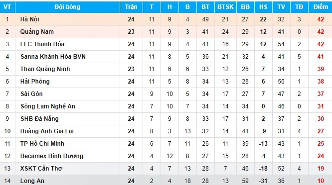 Trọng tài chính Ngô Duy Lân thổi còi cho trận đấu giữa Hà Nội và TP.HCM ở vòng 24 V-League được bắt đầu. Ở trận đấu giữa XSKT Cần Thơ và Sanna Khánh Hòa đang có tỷ số hòa 1-1, tính đến phút 70.