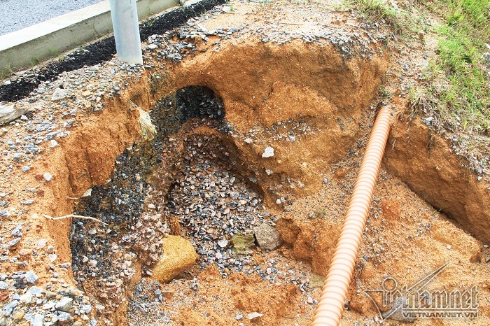 Tại đây có một cống thoát nước ngang tuyến đã bị bong tróc phần mố và sạt lở nghiêm trọng. Đơn vị thi công đã vá nhiều lần nhưng không xử lý dứt điểm.